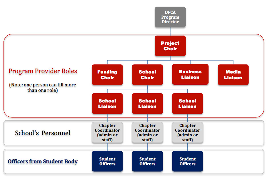 Below is an example of how a community branch is structured. The community group in this example is providing Drug Free Clubs of America for 3 schools in their community. They fulfill the roles in red, the schools each assign a positive, upbeat club coordinator (in gray), and the coordinators each choose their student officers (in blue). Once the teens are selected and engaged – that’s when the magic happens!